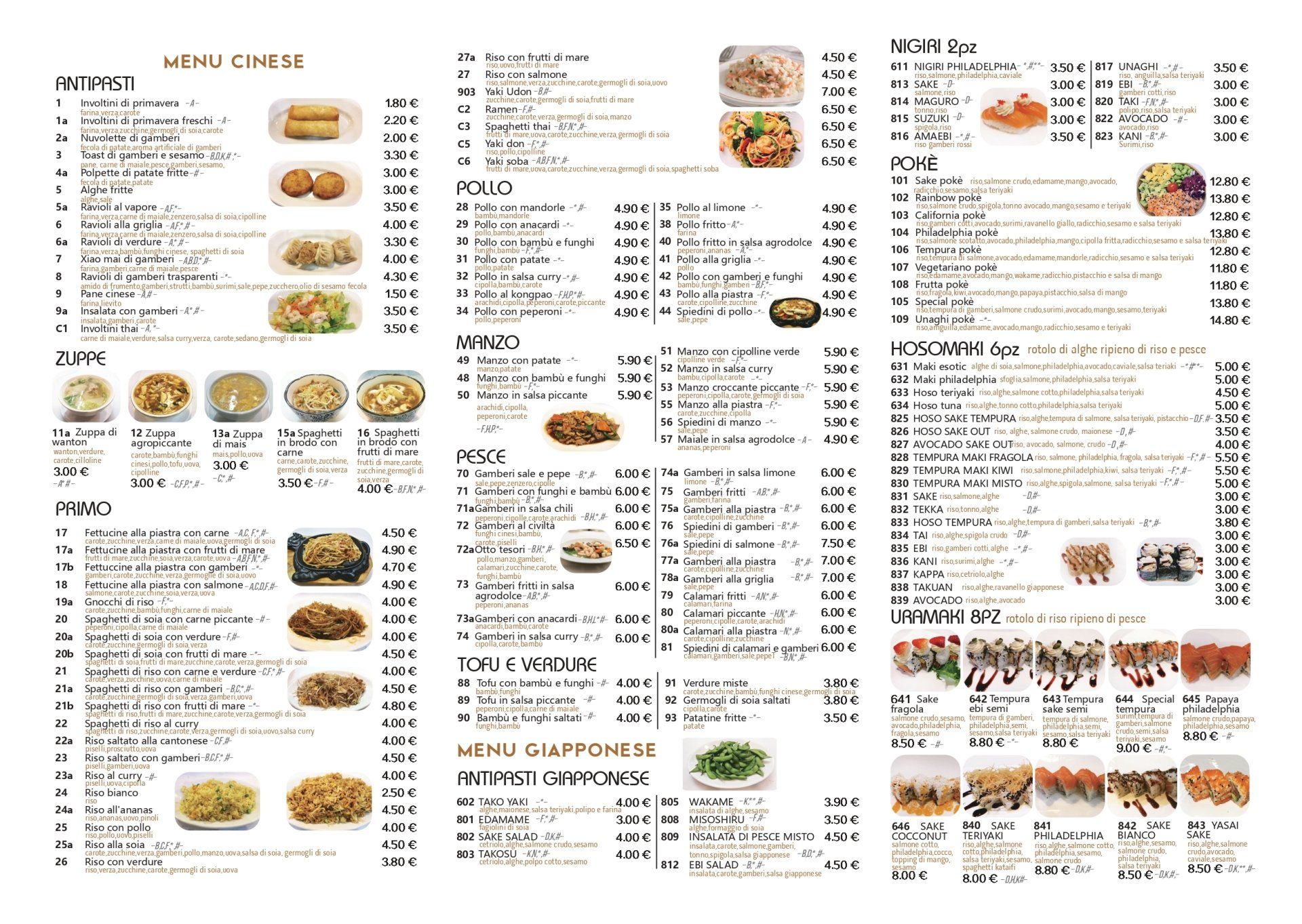 Il menù del ristorante cinese e giapponese è davvero ampio e variegato, e comprende sia piatti con pesce crudo, come uramaki, futomaki, hosomaki e nigiri, che pietanze calde come riso alla cantonese, maiale in agrodolce e preparazioni a base di salmone e gamberetti.